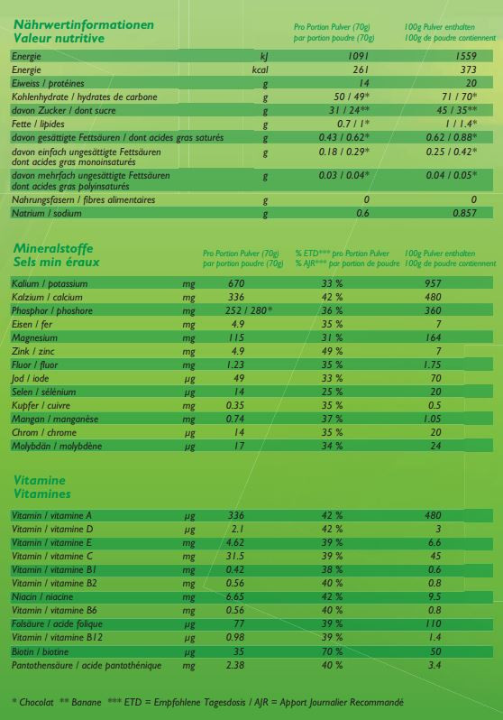 Maltodextrin, szacharóz, sovány tejpor , kalcium- kazeinát , tejsavófehérje -koncentrátum, dextrinizált keményítő, dextróz, savanyúságot szabályozó anyag (nátrium-citrát), kálium-klorid, banánaroma, ortoforsav kalciumsói, magnézium-oxid, színezék (béta-karotin), vitaminkeverék (lásd a táblázatot), cink-glükonát, vas-fumarát, mangán-glükonát, nátrium-fluorid, réz-glükonát, króm(III)-klorid, nátrium-szelenit, nátrium-molibdát, kálium-jodid